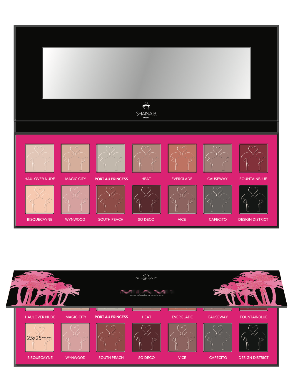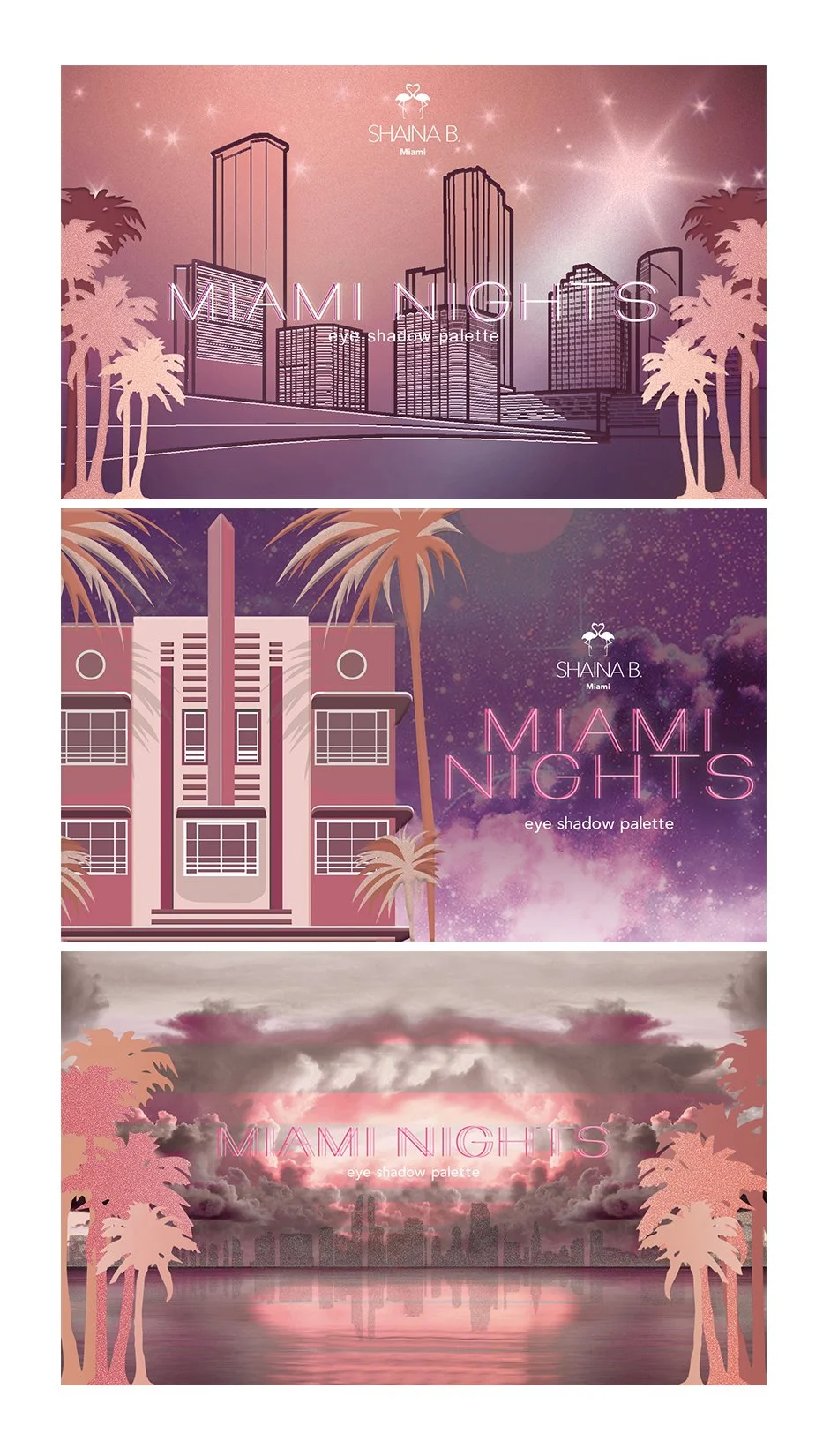 In addition to the core product line, the packaging system was designed to support special editions and tonal shifts without losing brand recognition. The Miami Nights palette was developed as an extension of the Shaina B. Miami visual language, maintaining the brand’s signature illustration style and typography while introducing a new color direction inspired by dusk and nightlife.